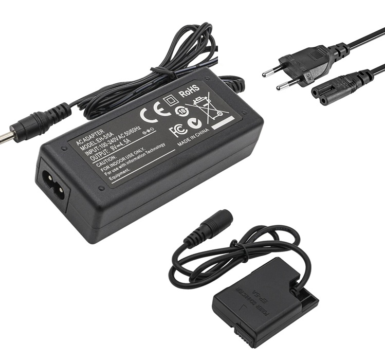 - Instalación simple: se coloca el acoplador EP‑5A en el compartimiento de batería de la cámara y se conecta el adaptador EH‑5 a la red eléctrica.